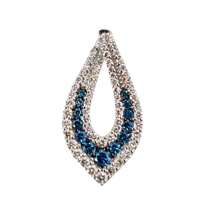 This elegant white gold pendant features a stunning teardrop design with sparkling blue and white diamonds. With a total of 13 blue diamonds and 0.32 carats of white diamonds, this pendant adds a touch of sophistication and color to any outfit.