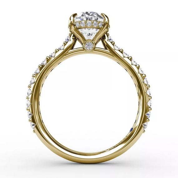 Celebrate your love with timeless elegance. This stunning 14 karat yellow gold engagement ring features a classic design with a modern twist: a hidden halo that adds a subtle brilliance that quietly enhances the ring.