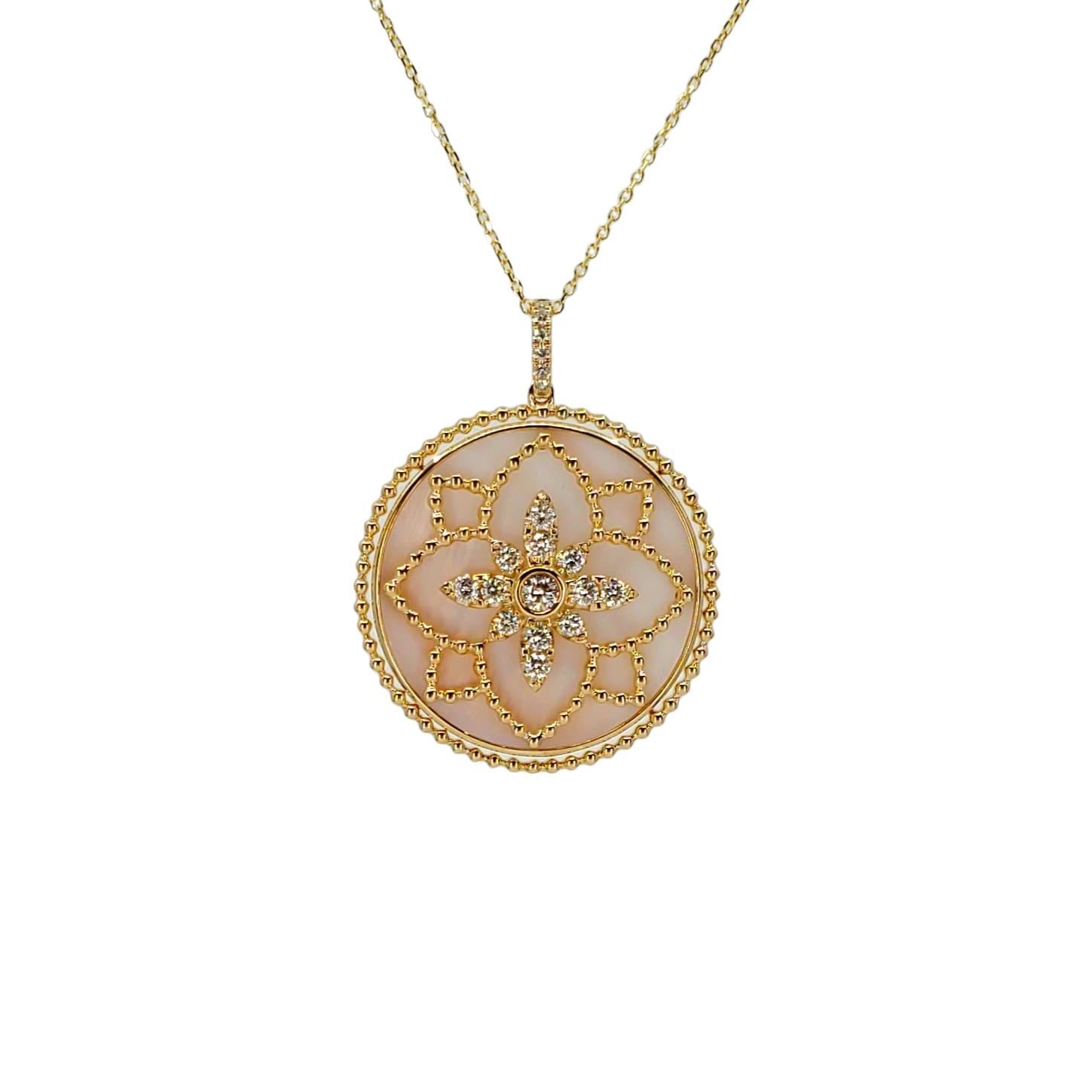 Experience the dashing duality of our reversible mother of pearl necklace! Crafted from 14 karat yellow gold, this eye-catching disc pendant features 13 sparkling round H color Si2 clarity diamonds totaling 0.50 carats and a 6.25 carat round pink mother of pearl backdrop. Choose style and stand out with this beautiful pendant!