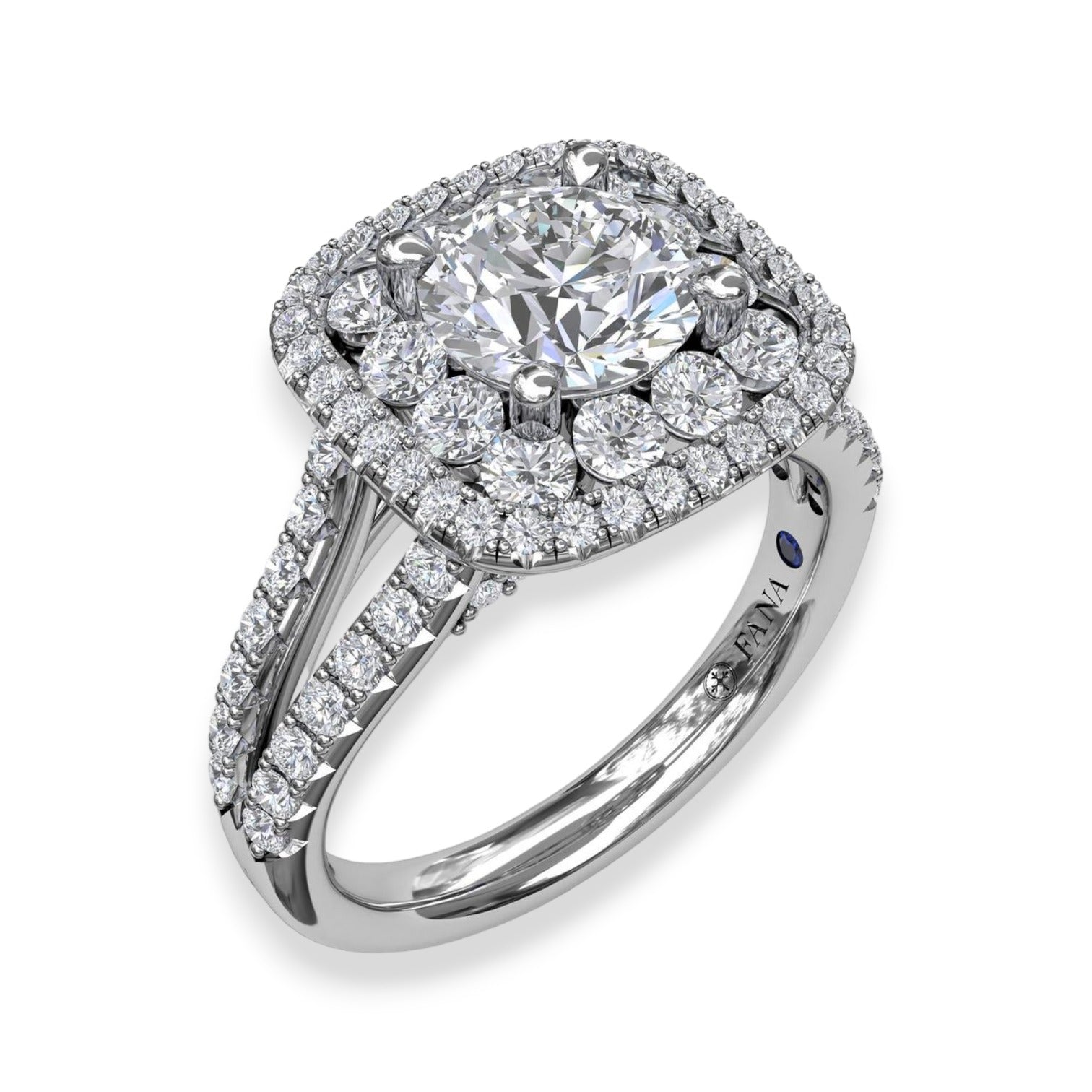 Crafted from high-polish 14K white gold, the sleek metal enhances the luminosity of the diamonds while providing a smooth, elegant finish. The halo setting not only amplifies the appearance of the center stone, but also adds a touch of vintage charm to a thoroughly modern design.