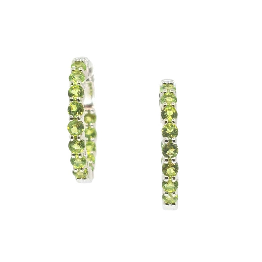 These stunning inside-out hoop earrings are crafted from elegant white sterling silver, offering a timeless and versatile design. Each earring is adorned with 26 vibrant, round-cut peridots, measuring 3.00mm. The peridots are meticulously set along both the outer and inner edges of the hoops, creating a dazzling effect from every angle.