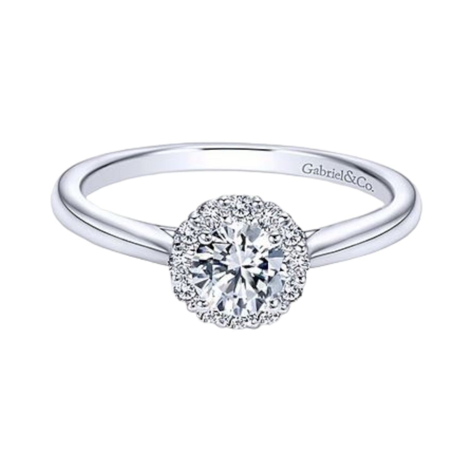 This elegant plain shank engagement ring is crafted from 14 karat white gold and features a sparkling halo of 12 round G/H color diamonds with a total weight of 0.12 carats. The simple and timeless design is perfect for showcasing its 1/2 carat center diamond.
