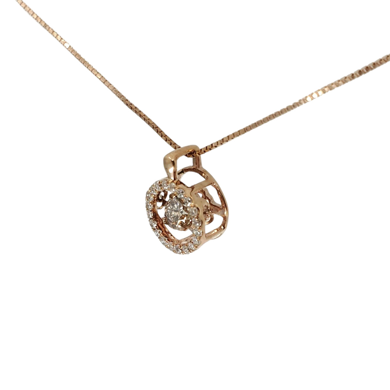 This beautiful necklace is perfect for adding a touch of classic style to any outfit. Crafted in 14 karat rose gold, this one of a kind necklace features a dazzling 0.23 carat round SI1 chocolate diamond pendant and twenty 0.07 carats in round J SI2 diamonds that sparkle and shine with each movement. This pendant features a "dancing diamond" that moves with you to capture the light!