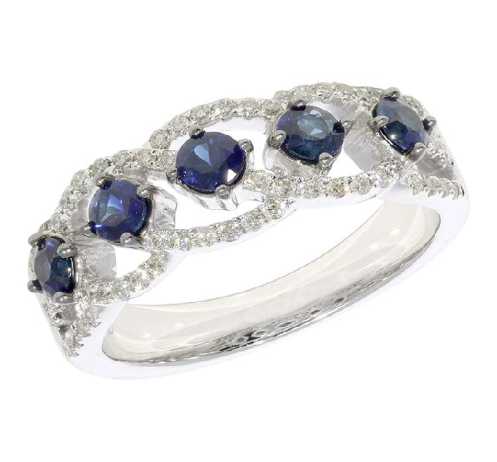 This dazzling sapphire band is designed with a unique crossover style, adorned with 5 round sapphires totaling 0.83 accented by 0.32 carats in round I color Si2 clarity diamonds.