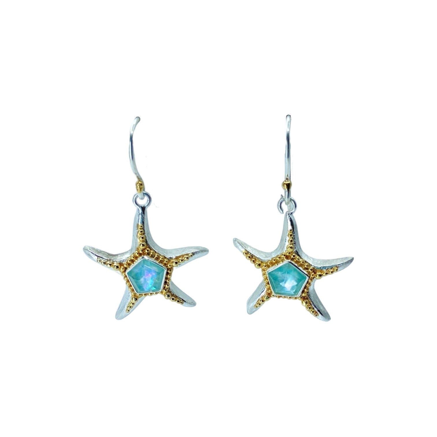 Capture the essence of seaside elegance with these starfish drop earrings, beautifully crafted with a layered cabochon of amazonite, mother of pearl, and clear quartz. The soft blue-green tones evoke ocean tranquility, while the starfish motif adds a playful, coastal-inspired charm.