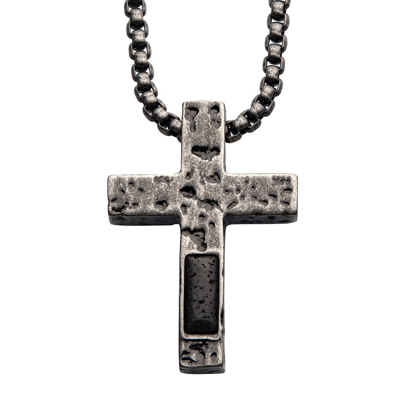 Make a bold statement with our stainless steel cross pendant. With its sleek design and unique lava stone inlay, this pendant measures 35.1mm in width, 24.6mm in height, and 5.7mm in thickness, adding a touch of sophistication to any outfit. Stand out from the crowd with this unique and stylish accessory.