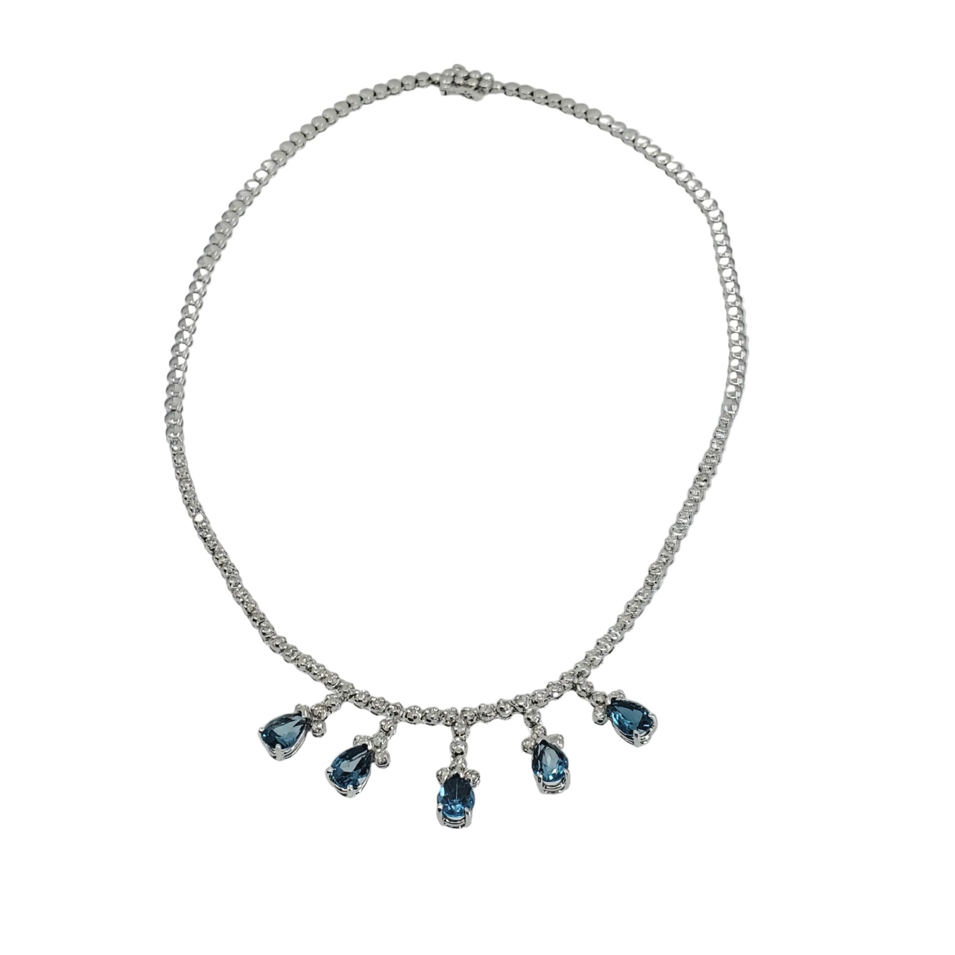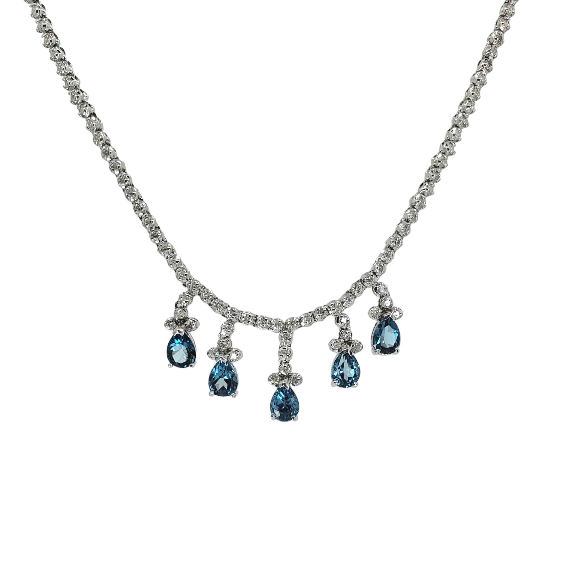 Elevate your jewelry collection with this dazzling blue topaz pendant. Crafted from luxurious 14 karat white gold, this necklace features 5 stunning pear-shaped blue topaz dangles and 77 sparkling round diamonds totaling 1 carat. Perfect for any occasion, this necklace adds a touch of elegance and sophistication to any outfit.