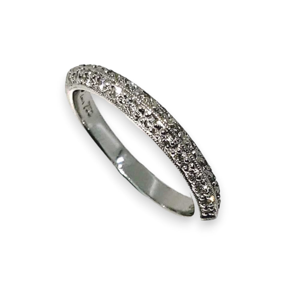 Set with 26 round H color, SI1 clarity diamonds totaling 0.15 carats, the pavé setting adds delicate sparkle without overpowering the design. Crafted in rich 18 karat white gold, this ring blends timeless beauty with contemporary sophistication.