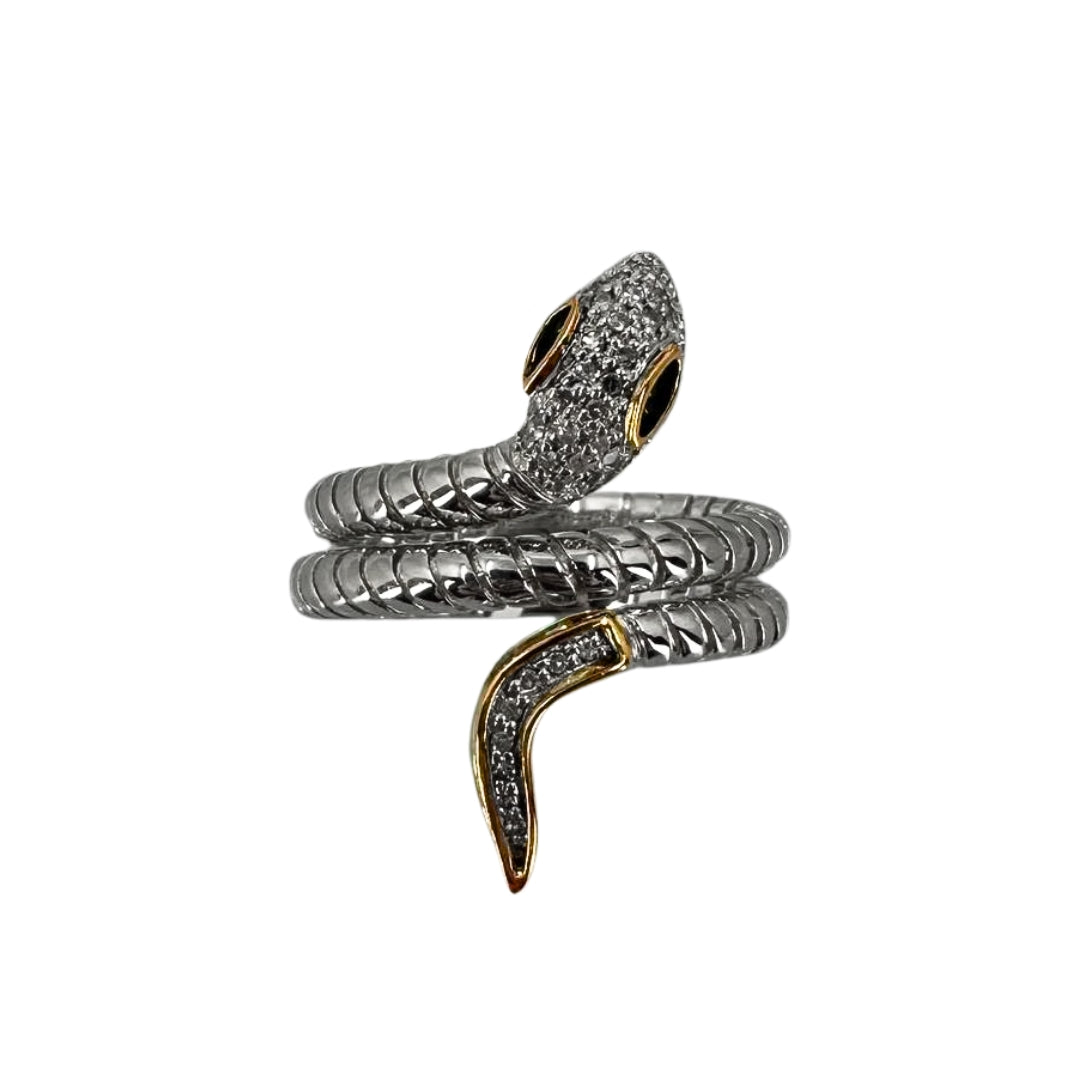 Two Tone 14K/Sterling Snake Ring Size 7 With 36 = 0.10Twt Round Diamonds And 2 = 0.06Twt Round Tsavorite Garnets