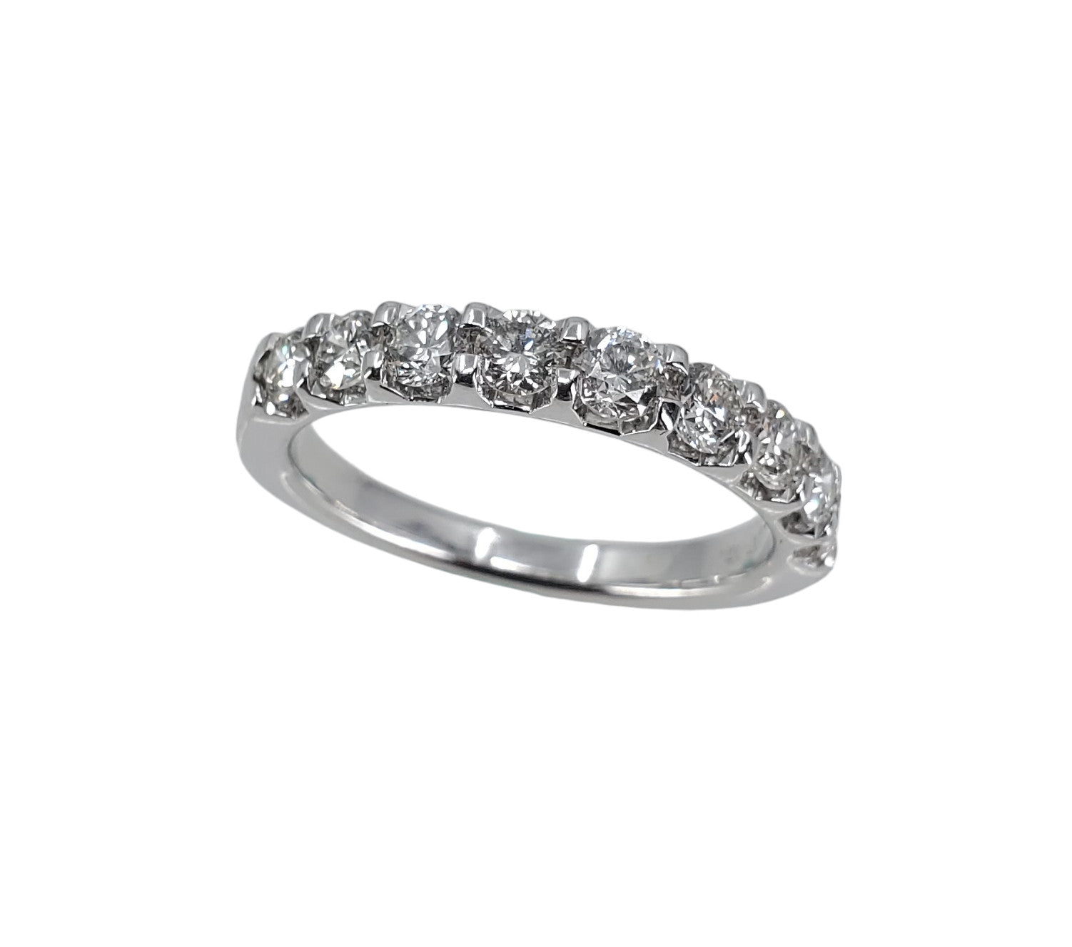 Classic and radiant, this white 14 karat gold wedding band features nine round diamonds totaling 1.00 carat. Each diamond, graded I color and SI2 clarity, is set in a secure shared prong setting, allowing for maximum brilliance and a sleek, seamless look. Size 7, this elegant band is perfect as a wedding ring, anniversary gift, or sparkling addition to a stacked ring set.