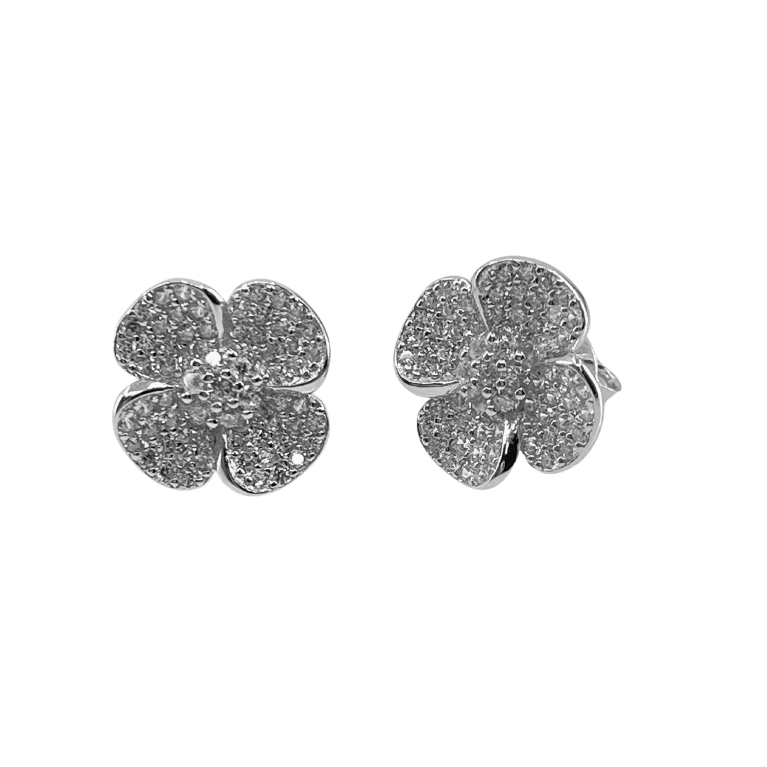 These white silver earrings are a stunning blend of elegance and charm. Crafted from shining sterling silver, these earrings feature a delicate flower design adorned with pave-set cubic zirconia stones, creating a dazzling sparkle. The intricate detailing and polished finish add a touch of sophistication, making them perfect for both everyday wear and special occasions.